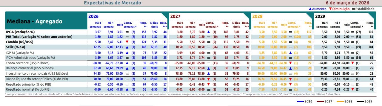 Com base nos relatórios mais recentes do Boletim Focus, as perspectivas de mercado para os próximos anos da economia nacional indicam um cenário de gradual acomodação da inflação, após um período prolongado de taxas de juros em patamares elevados, combinado a um crescimento econômico moderado.