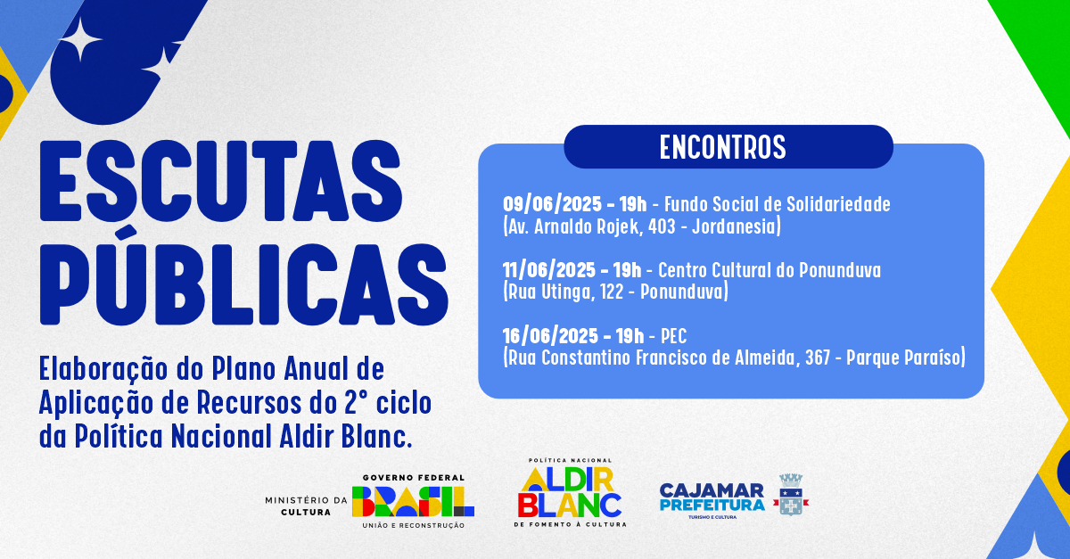 A Prefeitura de Cajamar, por meio da Secretaria Municipal de Turismo e Cultura, convida toda a sociedade civil, em especial os artistas, produtores culturais e membros do Conselho Municipal de Cultura, para participar das Escutas Públicas voltadas à elaboração do Plano Anual de Aplicação de Recursos do 2º ciclo da Política Nacional Aldir Blanc de Fomento à Cultura (PNAB).