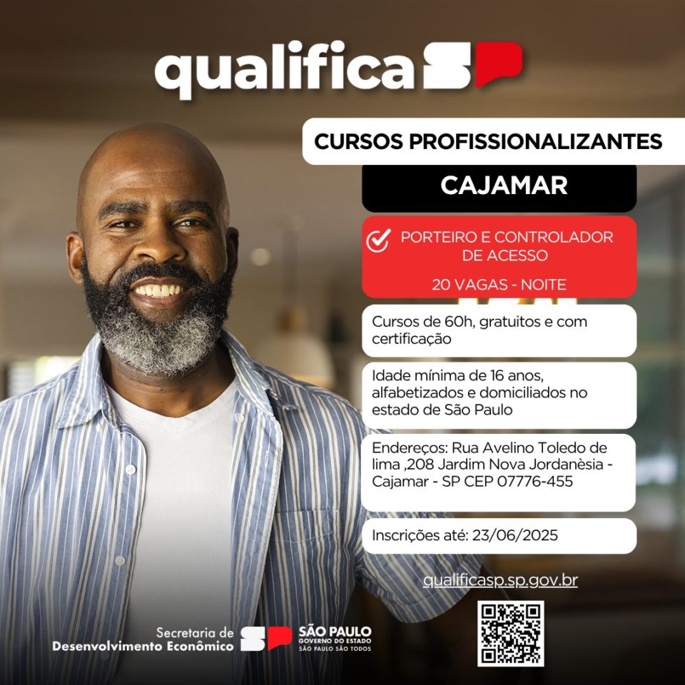 A Prefeitura de Cajamar, por meio da Secretaria Municipal de Emprego e Relações de Trabalho, em parceria com o Governo do Estado de São Paulo, informa que estão abertas as inscrições para os cursos gratuitos presenciais do Qualifica SP – Novo Emprego, que vão impulsionar sua qualificação profissional.