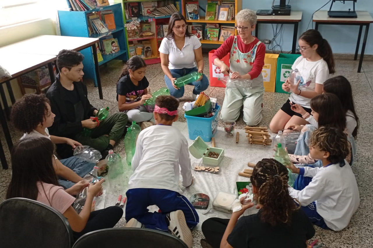 Houve ainda contação de história sobre a importância da preservação da natureza, e os alunos construíram ecobrinquedos com materiais recicláveis doados.