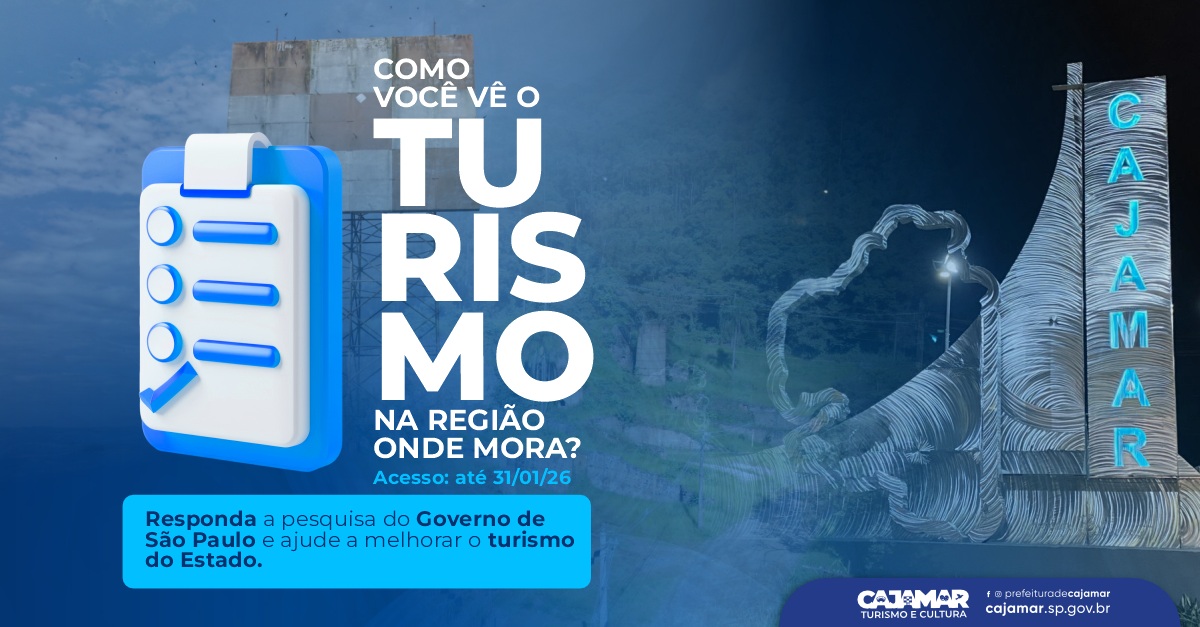 Já está no ar a Pesquisa On-line de Percepção do Turismo, aberta à população de todos os municípios paulistas. O Governo de São Paulo lançou a pesquisa para saber como a população vê o turismo em suas cidades e regiões. É uma oportunidade de os moradores de Cajamar ajudarem a melhorar o turismo no Estado.