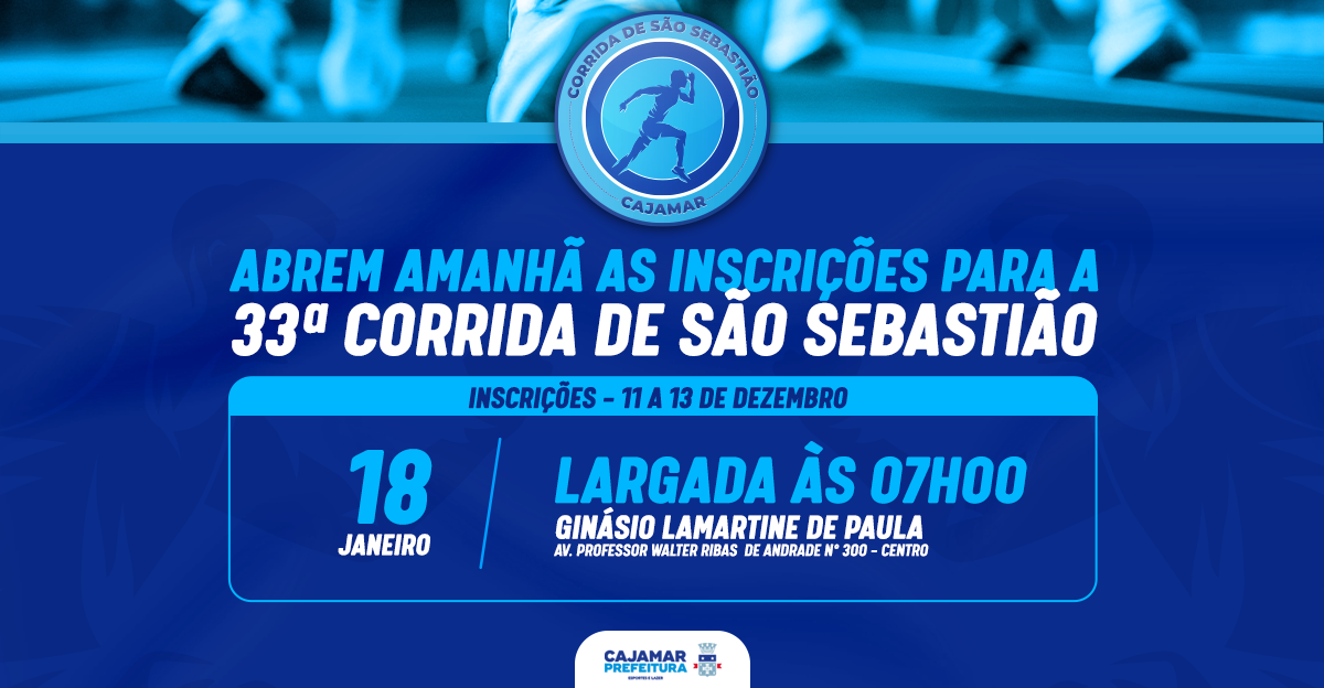 As inscrições para a tradicional Corrida de São Sebastião, que chega à sua 33ª edição em 2026, estarão abertas a partir de amanhã, dia 11. O evento ocorrerá em 18 de janeiro, domingo, como parte das homenagens ao Santo Padroeiro de Cajamar, que é celebrado no dia 20 de janeiro. As vagas são limitadas a 600, por isso garanta logo a sua!