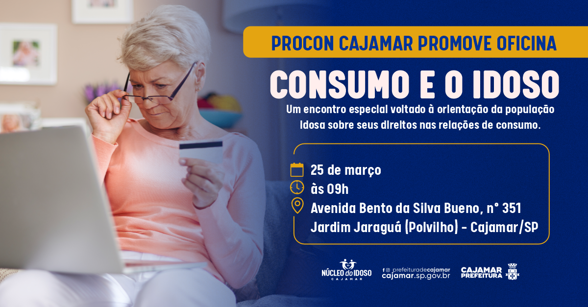 O Procon Cajamar, em parceria com a Fundação Procon-SP, realizará no próximo dia 25 de março, às 9h, a oficina “Consumo e o Idoso”, voltada à orientação e conscientização da população idosa sobre seus direitos nas relações de consumo.