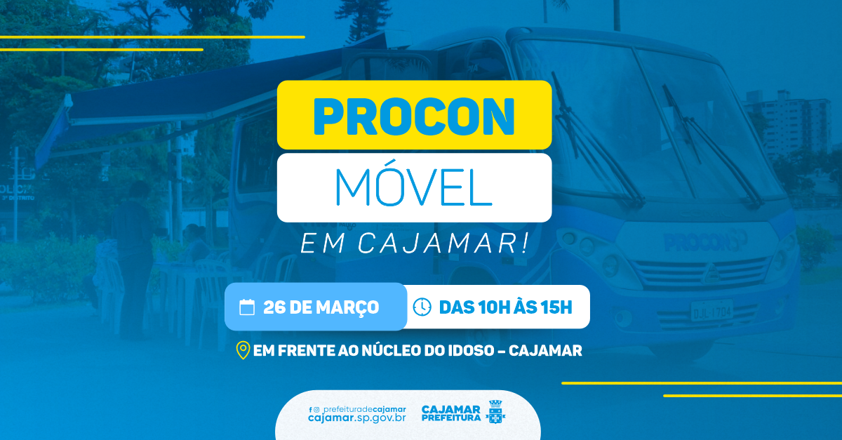 A Prefeitura de Cajamar informa que o Procon Móvel estará na cidade no próximo dia 26 de março, oferecendo atendimento presencial e gratuito à população.