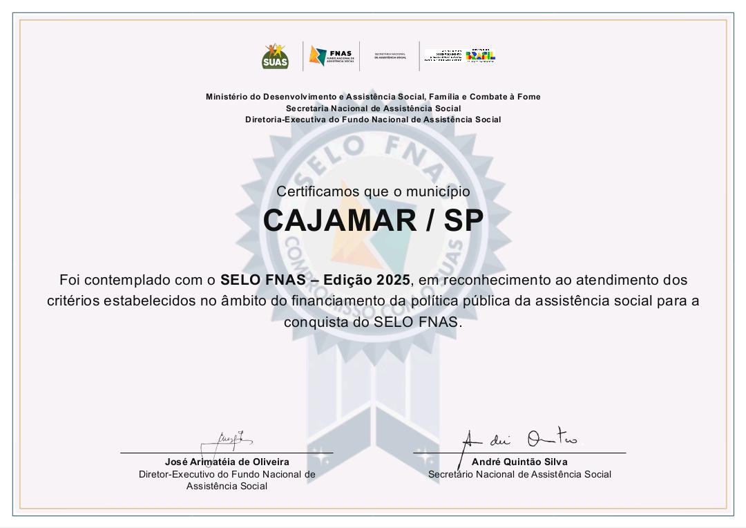 O município de Cajamar, por meio da Secretaria Municipal de Desenvolvimento Social, foi contemplado com o Selo FNAS – Edição 2025, certificação concedida pelo Fundo Nacional de Assistência Social (FNAS), vinculado ao Ministério do Desenvolvimento e Assistência Social, Família e Combate à Fome, do Governo Federal.